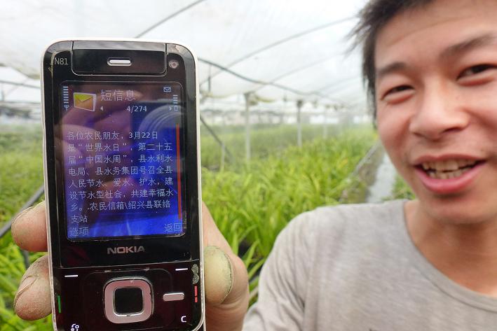 圖為農(nóng)民朋友正在查看通過“農(nóng)民信箱”發(fā)送過來的節(jié)水知識(shí)短信